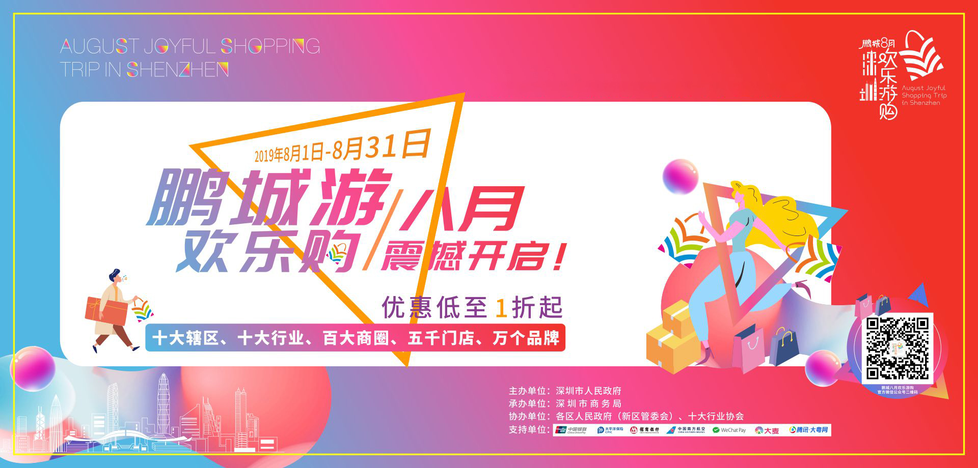本次活動(dòng)由深圳市人民政府主辦,深圳市商務(wù)局承辦,各區(qū)人民政府(新區(qū)管委會(huì))和十大行業(yè)協(xié)會(huì)協(xié)辦。活動(dòng)以“鵬城游·歡樂購”“深圳let’s 購”“深圳不限購”“樂享盛夏·歡購鵬城”等為口號(hào),整個(gè)8月將在全市營造“天天有優(yōu)惠、周周有活動(dòng)、行行促消費(fèi)、區(qū)區(qū)有特色”的熱情氛圍。